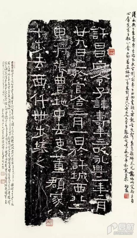 左跋:君不見桓靈之政如垂堂,忠諫塞路賢夸傷,三輔千門久荊棘,許城西北何茫茫。文曰于許城西北二里。隴畝千年常不改,斷土崩埏,至今在官舍,無人問故阡。文曰亡于官舍,又曰……。漢桓帝永興二年,梁冀方為大將軍未誅。辛未秋,八月十二日,心畬手拓漢永興二年墓記并題。