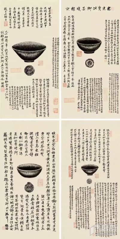 此次征集到的這一套拓片作品,均為當世不同典范建盞,且有清晚期金石名家鄭文焯長跋于上。傳拓精良,一軸「鄭文焯」作簽一行,題長跋四段,鈐朱白印八方;二軸「老芝」題長跋五段,鈐朱白印九方;三軸「大鶴山人」題長跋一段,鈐朱印三方;四軸「小坡」題長跋四段,鈐朱白印八方。題跋記載有著錄句、詩詞句、事例句、名人句、見解句等等,內容豐富,滿題依附在建盞拓片四周圍,由此可見此為鄭氏精致用心之作。